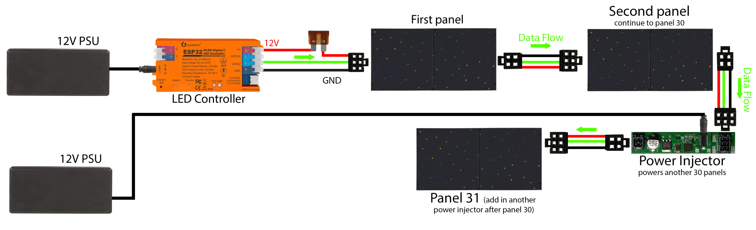 PSU #2: Power Injector: For panels 31–60, plug a second 12V power supply into the power injector after panel 30.