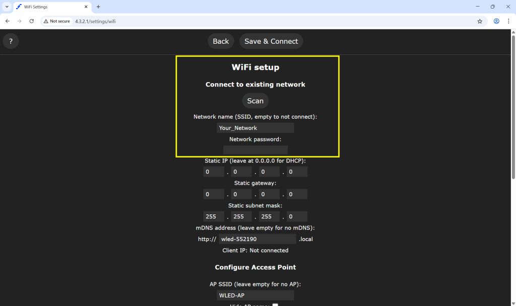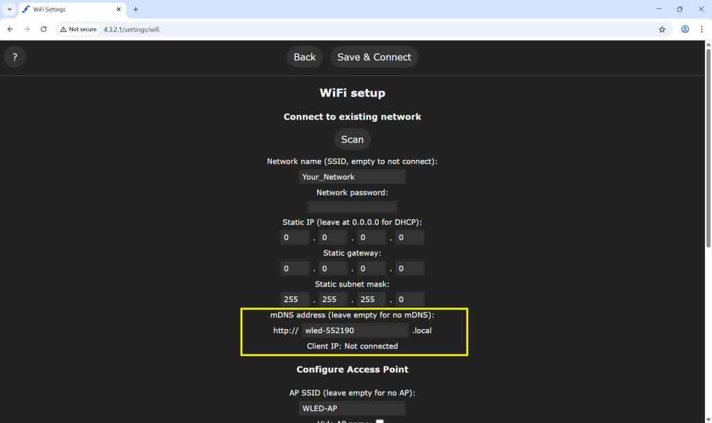 - Connect to the local network, then enter either your new mDNS address or the IP address into your browser’s URL bar. (The IP address will be generated once the device is connected to Wi-Fi.)