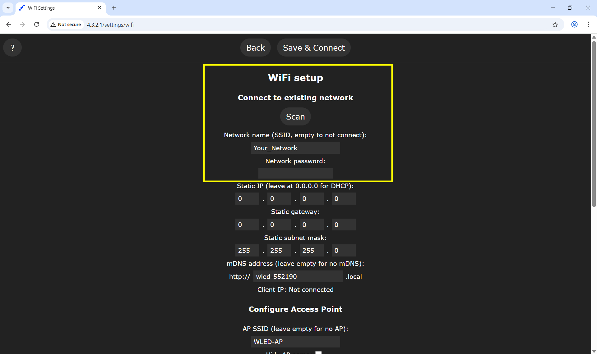 When first powered, WLED creates a temporary Wi-Fi network called WLED-AP.